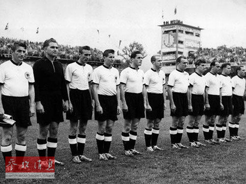 1954年世界杯决赛,西德队战胜了匈牙利队夺得冠军。但据研究报告披露,一些西德队员当时服用了兴奋剂。图为西德队列队等候决赛开赛。