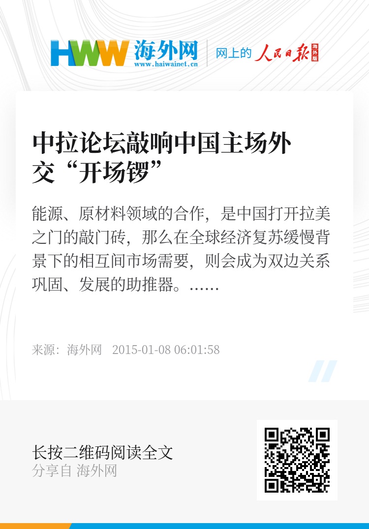 2014年1月,在哈瓦那双边第二次峰会上敲定中拉论坛这一常设论坛机制,其目的,是有助于中国和拉美及加勒比国家间更有效率地展开谈判和交流,从而巩固双边关系。机制的设立和常态化,标志着中国和拉美关系进入崭新的阶段。随着美国放弃“门罗主义”和拉美各国多边主义外交共识的形成,诸多拉美国家都开始将目光投向太平洋,并日渐认识到发展与中国关系的重要性。据官方预计,未来10年中国对外投资将达1.25万亿美元,这对于曾饱受债务危机之苦、迫切需要经济大发展启动资金和基础设施建设的拉美各国而言,无疑具备极大的吸引力。