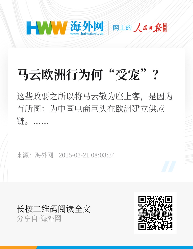 众所周知,今年的政府工作报告8次提到互联网,还首次提出将制定“互联网+”行动计划,推动移动互联网、云计算、大数据、物联网等与现代制造业结合,促进电子商务、工业互联网和互联网金融健康发展,引导互联网企业拓展国际市场。可以说,马云受欧洲政要青睐,正直接见证了中国互联网企业拓展国际市场的努力与成就。如果说,第一次工业革命生产工具是蒸汽机,第二次工业革命是电,而第三次工业革命则是互联网,我们曾经错失两次工业革命,那么在互联网时代,我们不再是配角,不是落伍者,一定程度上说已是领跑者。