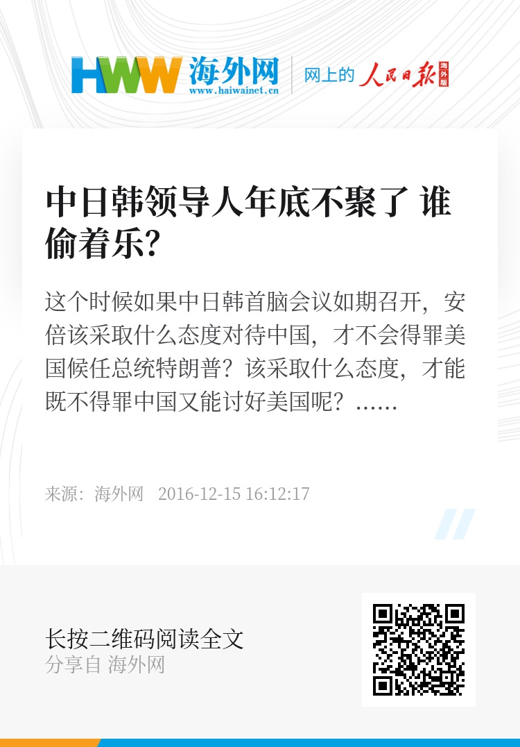 近期韩国政局出现动荡,韩国国会表决通过了针对总统朴槿惠的弹劾,使韩国暂时没有正式的国家元首出席。如果将取消此次中日韩三国领导人会谈归结于这个原因,不得不说只看到了表面原因。更深层次的原因在于,美国候任总统特朗普还没有正式上台,日本不知道未来美国会对中国采取何种政策。日本自认为是美国在亚洲最铁杆的盟友,美国没开口,日本是不敢擅自作主的。特别是特朗普对于“重返亚太”没有表现出太多兴趣,使安倍乱了方寸,突然不知何去何从。如果在这种形势下避开美国,搞出一个不被美国认可的中日韩友好合作新局面来,美国对日本的责难将无法预测。最起码安倍的相位就坐不稳了。他怎敢开这个会呢?但国家间的元首会议,不是想开就开想停就停的,没有合适的理由是难以服人的。上哪儿去找合适的理由?正在无计可施之时,朴槿惠下台了。安倍算是捡到救命稻草了!