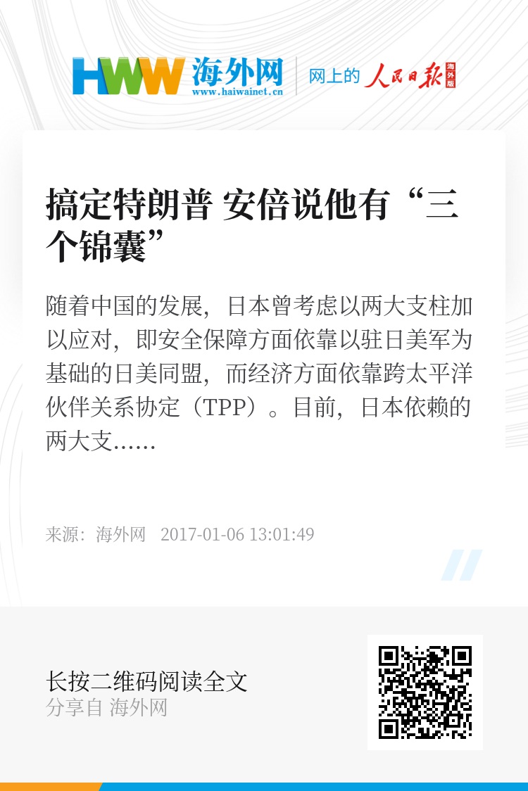 据日本经济新闻报道分析,目前看来,日本政府内部越来越多的声音认为,“通过(安倍)与特朗普的首次会谈,应该确定了日美同盟的强化”。不过,是否真的如安倍所推断的“不用担心”安全保障,还需要等特朗普正式就任美国总统,政权的基本方针出台后才能得知。毕竟,最近的一份美国公司智库报告中,已经将本月走马上任的特朗普视为2017年世界“十大风险”之首。面对“特朗普变量”,世界仍然充满着不确定性。(整理/李鹏宇)