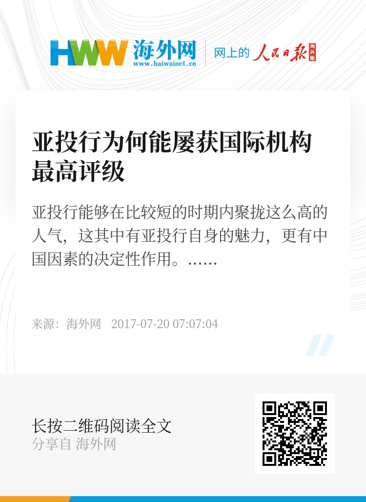 近期,国际评级机构惠誉公司对亚洲基础设施投资银行(AIIB)给出最高评级3A级别,这是继6月份国际评级公司穆迪给予3A评级之后,一次更有力的评级。这再次证明,亚投行的经营不仅被给予充分肯定,也说明国际评级机构对亚投行未来的发展充满了信心。