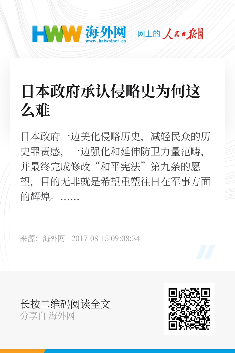 日本对侵略历史讳莫如深,其实就是为了“维护”国家荣誉和“捍卫”民族尊严,从而使日本国民在历史的“自豪感”中支持政府的政治路线和军事野心。日本政府担心,如果对历史深刻认罪,民众将会背上负罪感,在这种情况下,日本的防卫政策很难真正实现由“专守防卫”转向“主动遏制”,更遑论跟随美国全球作战。日本政府一边美化侵略历史,减轻民众的历史罪责感,一边强化和延伸防卫力量范畴,并最终完成修改“和平宪法”第九条的愿望,目的无非就是希望重塑往日在军事方面的辉煌。