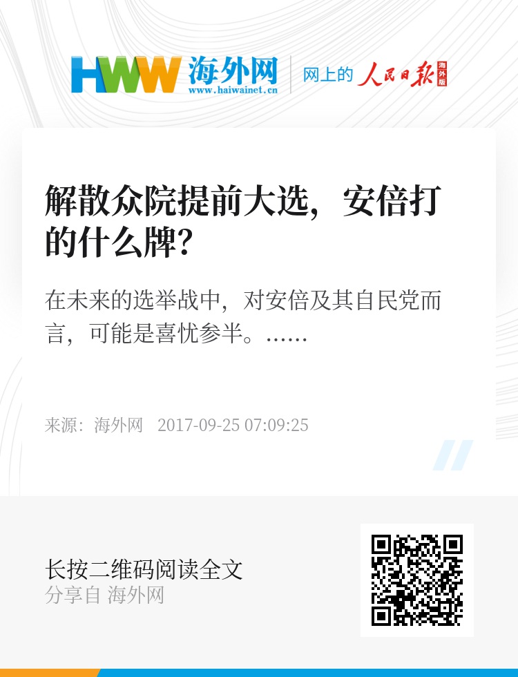 最近,安倍透露出要解散众议院,提前举行众议院大选。日本共同网披露称,自民党高层已经确定竞选承诺方案,包括推进安倍经济学、实行免费教育的育人革命、改革工作方式、应对朝鲜问题、修改宪法五大要点。这其中的免费教育和应对朝鲜的政策,对日本民众比较有吸引力,恐怕是自民党应对选举方案当中的亮点。