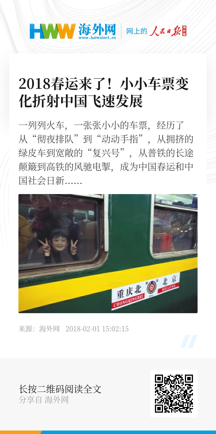 飞机价格太高,汽车时间太久,铁路成为历年春运最受欢迎的出行方式。2018年春运全国铁路预计发送旅客3.9亿人次。一列列火车,一张张小小的车票,经历了从“彻夜排队”到“动动手指”,从拥挤的绿皮车到宽敞的“复兴号”,从普铁的长途颠簸到高铁的风驰电掣,成为中国春运和中国社会日新月异变化的忠实见证者。