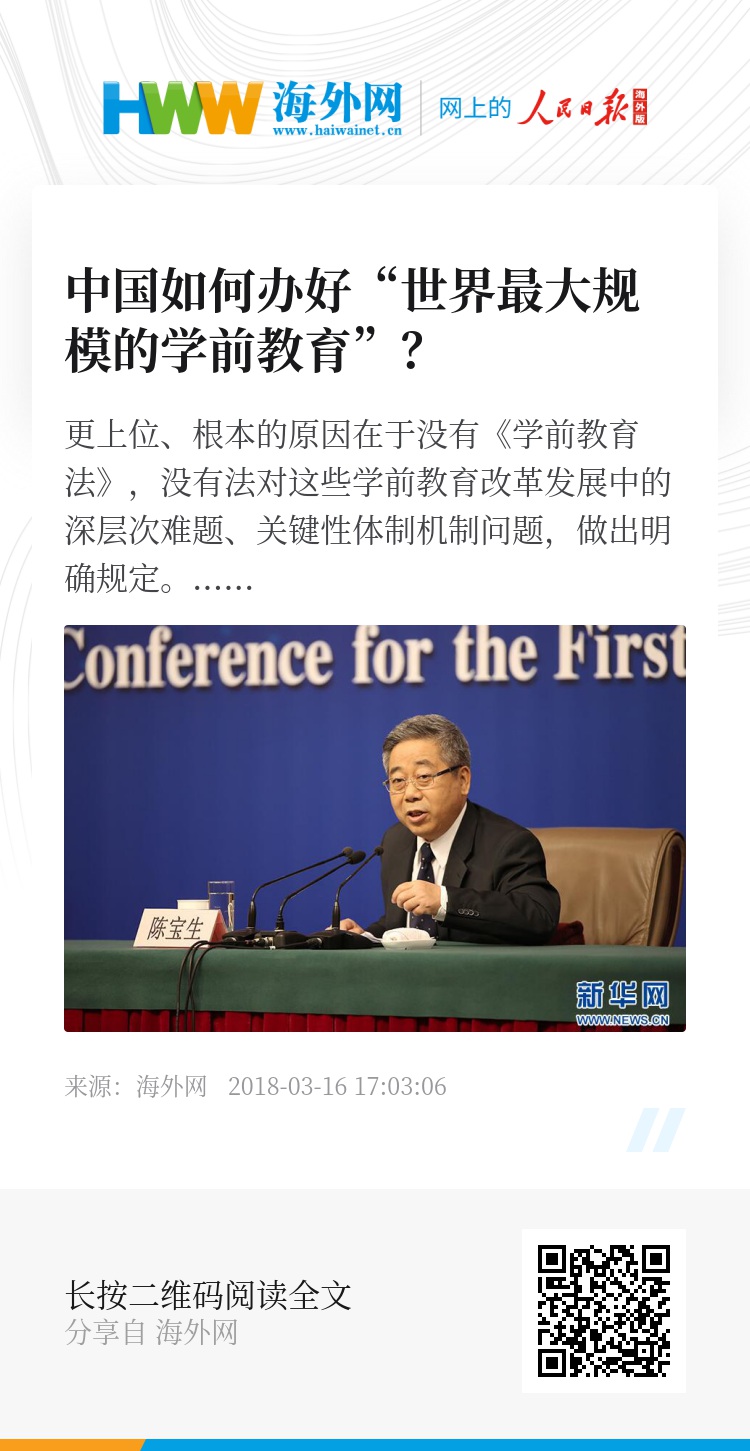 16日上午,教育部部长陈宝生就“努力让每个孩子都能享有公平而有质量的教育”相关问题回答中外记者提问。在记者会现场,陈宝生回答了有关学前教育的相关问题。
