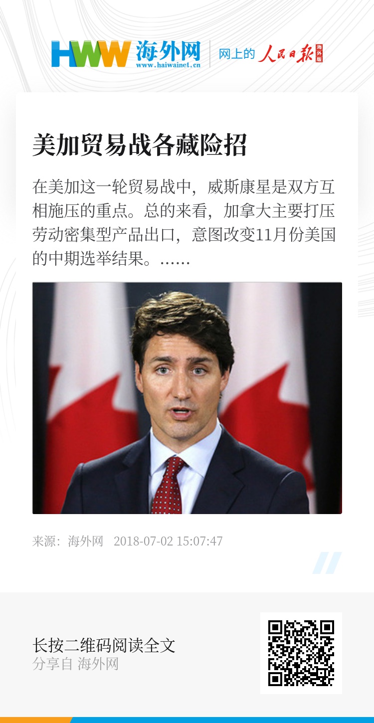 7月1日,加拿大政府正式宣布对美出口货物提高关税。由此,世界上双边贸易额最大的一组国家进入了贸易战状态。这是继中国、墨西哥和欧盟之后,美国的重要贸易伙伴实施对等反击的又一事例。