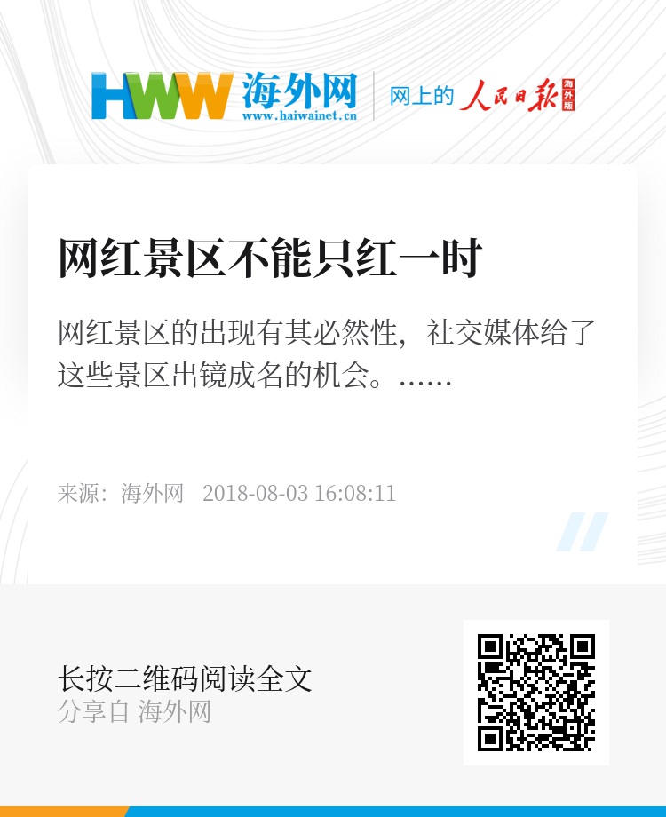 互联网时代,网红景区还会层出不穷。管理者在做好景区管理和服务的同时,也要更好地了解网络传播的效应,维护好景区的口碑和名声。任孟山建议,景区管理者应当充分考虑到网络传播的广度,更全面地考虑游客的需求,转变以我为本的认识,去适应传播环境的变化。网友感受到景区用心经营之后,相对地也就成为了景区宣传的正向媒介,使网红景区更好地发展下去。(海外网 吴正丹)