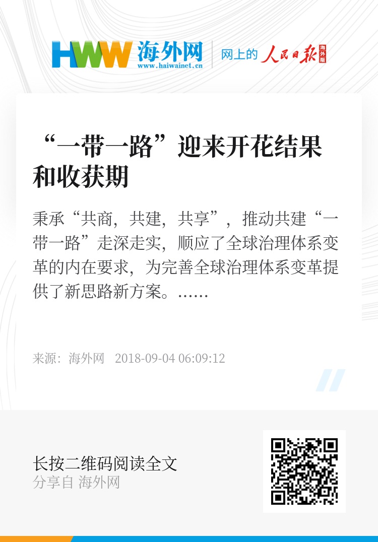 “一带一路”构建人类命运共同体的实践平台。展望未来,任务和挑战艰巨,但前景会越来越好。国务院签发的《外商投资准入特别管理措施(负面清单)(2018年版)》已于2018年7月30日生效,标志中国已经正式开放少至几万亿乃至10万亿美元的巨大市场,将会吸引来自包括美国在内的全球各地万亿美元的投资。以京津冀一体化、长江经济带和珠三角等为主的国内市场的深度开放与“一带一路”建设将会进入一个高频率的内外互通互动、相辅相成、相得益彰的状态,并逐渐提升为一个连接中国与世界的、跨国的、跨区域的乃至全球规模的共同市场,造福沿线国家人民,推动构建人类命运共同体。总之,秉承“共商,共建,共享”,推动共建“一带一路”走深走实,顺应了全球治理体系变革的内在要求,为完善全球治理体系变革提供了新思路新方案。