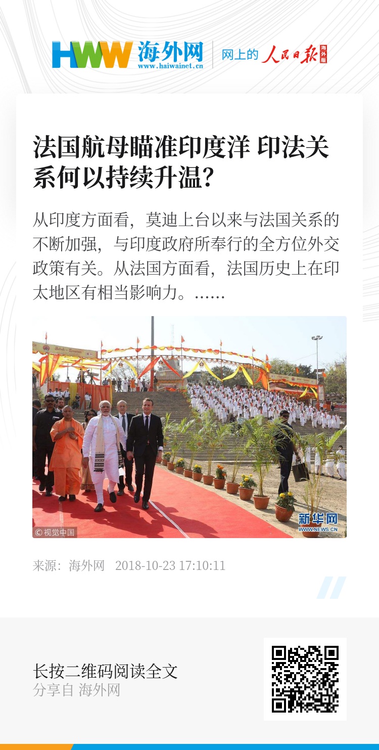此次航母或将前往印度洋,正是对3月法国总统马克龙访印期间签订的一项旨在加强印度洋军事合作协议的贯彻和落实。事实上,近年来法印双方在反对国际恐怖主义、联合国改革、贸易和投资领域进行了广泛而深入的合作。正如印度总理莫迪所言,法印合作领域从天上到地下无所不包。仅马克龙3月访印期间,法、印双方就签署了20个总价值为130亿欧元的协议,涵盖了航天合作和高速铁路、新能源等领域。是什么因素推动法印关系不断升温?