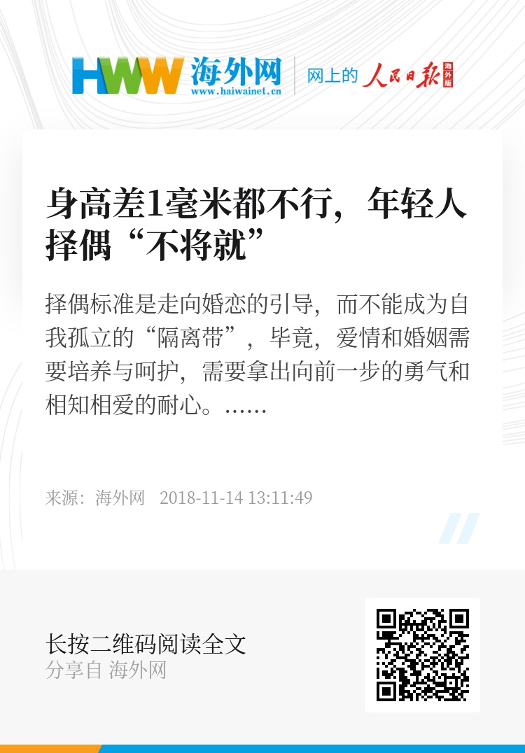 当前,因爱结合早已成为社会主流的婚恋价值观,择偶标准尽管是理性思考和选择的结果,但最终引导人们走向婚恋的是情感。因此,人们应该认识到,择偶标准是走向婚恋的引导,而不能成为自我孤立的“隔离带”,毕竟,爱情和婚姻需要培养与呵护,需要拿出向前一步的勇气和相知相爱的耐心。(人民日报海外网评论员 孟庆川)
