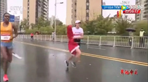 视频截图:中国选手何引丽拿着志愿者递来的国旗冲刺。