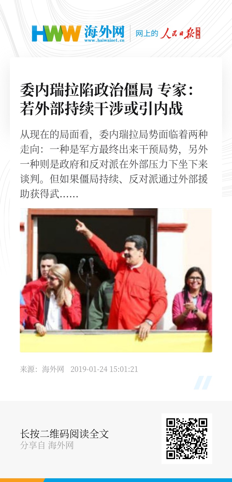 最危险的局面是,如果反对派通过外部援助获得武装,那委内瑞拉将有可能跌入内战的深渊,“这个国家将陷入更深重的危机”。(人民日报海外网 聂舒翼)
