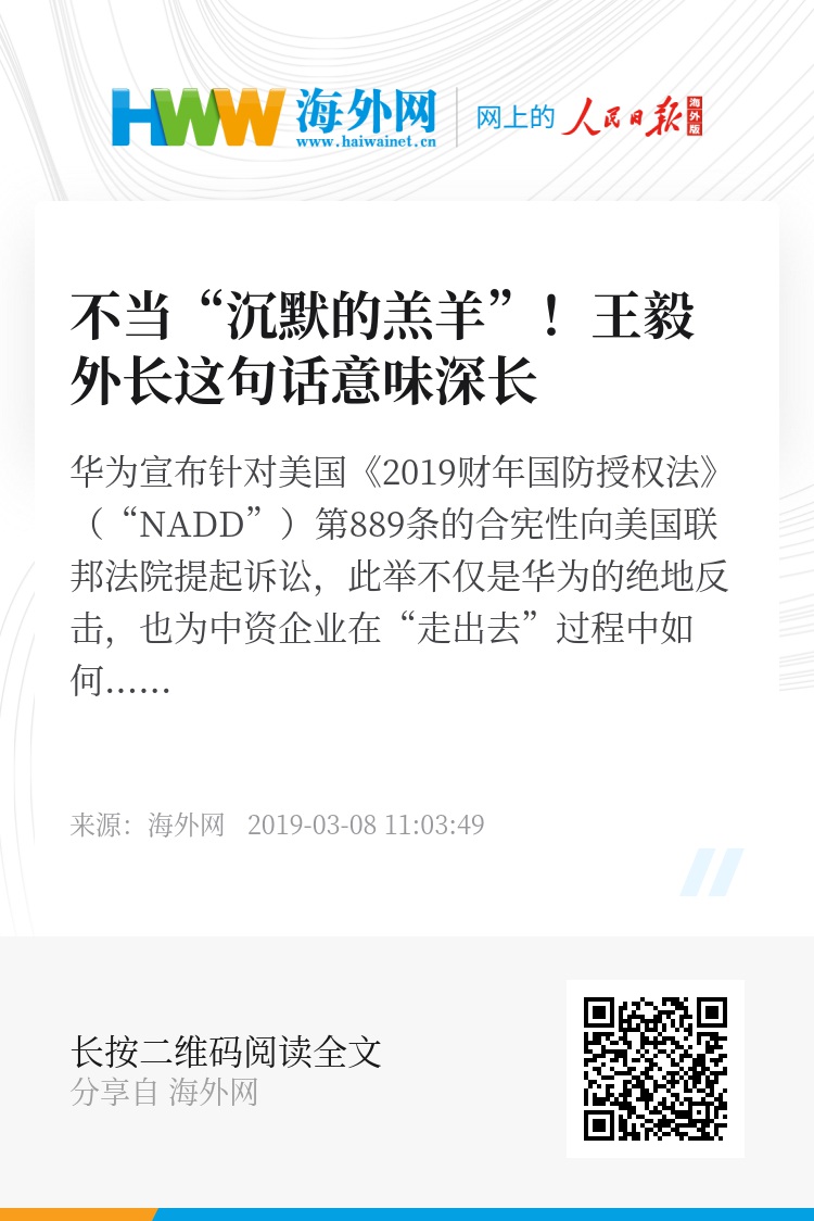 “我们也支持相关企业和个人拿起法律武器来维护自身权益,不当‘沉默的羔羊’!”国务委员兼外交部长王毅8日在出席十三届全国人大二次会议记者会时,对华为公司宣布起诉美国政府如是表态。