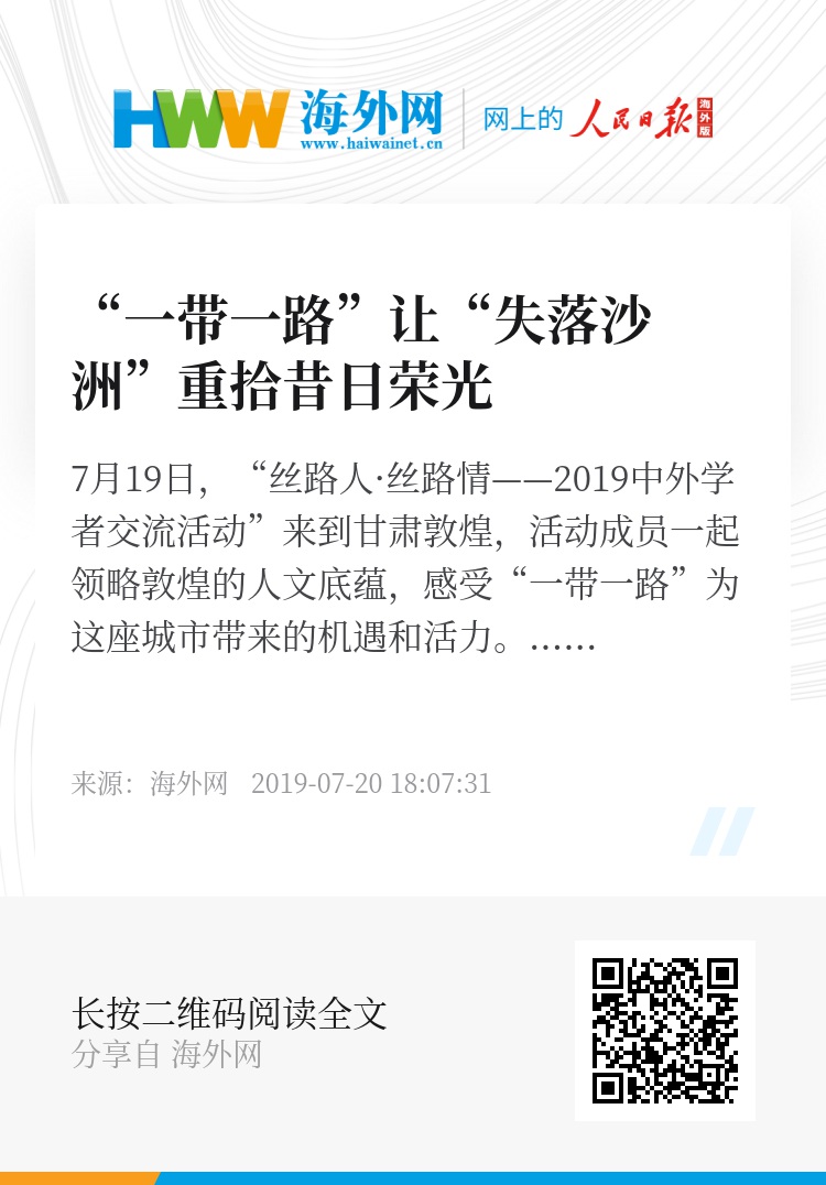 相信随着不同文明火花的不断碰撞,共建“一带一路”的步伐会越来越快,更多城市会如敦煌一样重拾昔日荣光,更多人民享受“一带一路”带来的繁荣开放。(海外网评论员 孟庆川)