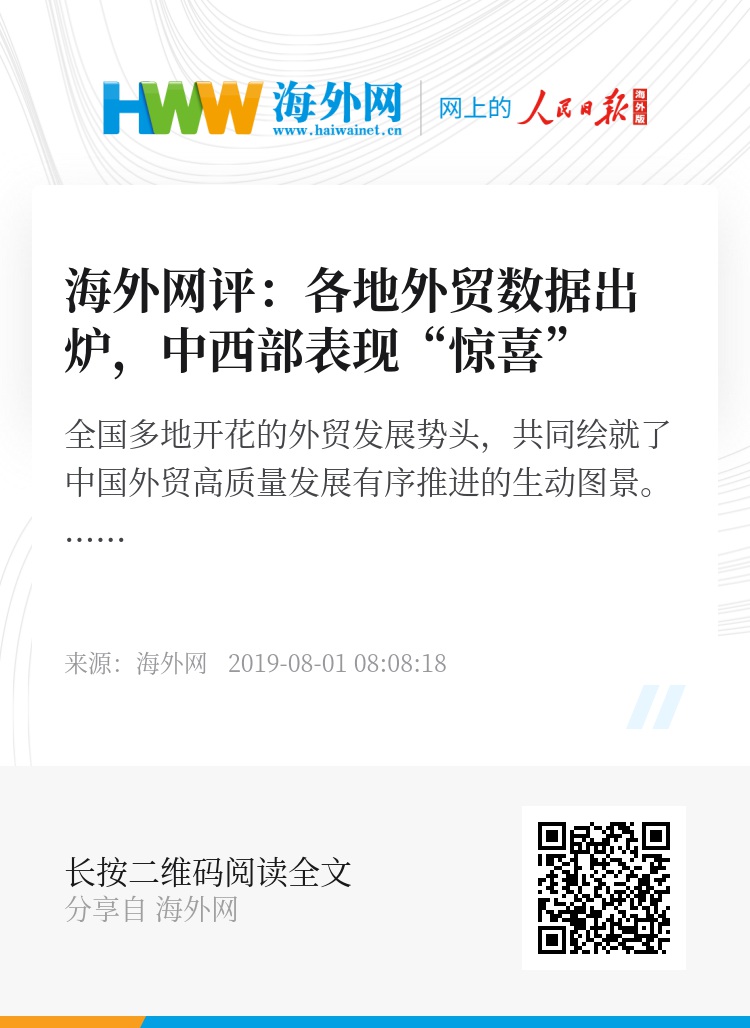 纵观2019年上半年中国外贸成绩单,西部地区也表现不俗。西部12省市区进出口增速为14%,高于全国进出口整体增速10.1个百分点。曾经的内陆腹地正在转变为开放前沿,得益于“一带一路”建设的深入推进。过去,中国对外经贸主要依赖海路,“一带一路”建设则让西部地区突破了地理困局。依托中欧班列,西部城市大力发展江海、铁水、铁空联运,进一步联通了21世纪海上丝绸之路。过去,中国口岸主要集中于东部沿海,内陆货物进出口必须运到沿海通关;近年来随着在内陆腹地设立一批批国家级口岸,中国同“一带一路”沿线国家深化大通关合作,西部地区也形成了口岸高地。可以说,西部开放发展的星星之火已呈燎原之势。