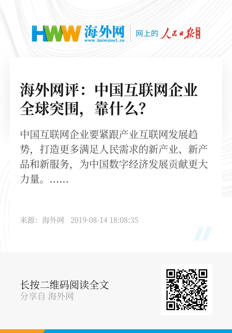 当前,中国互联网企业仍然面对诸多挑战,未来,还要紧跟产业互联网发展趋势,打造更多满足人民需求的新产业、新产品和新服务,为中国数字经济发展贡献更大力量。(海外网评论员 孟庆川)