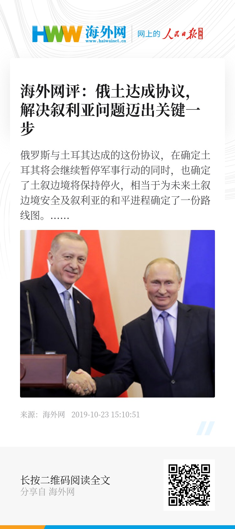 在经历了长达7小时的会谈之后,俄罗斯当地时间22日,俄罗斯总统普京与土耳其总统埃尔多安就土叙边境达成协议。根据协议,土耳其将停止军事行动,给叙利亚库尔德武装“人民保护部队”(YPG或SDF)150个小时撤出叙土边境,俄土将在叙利亚北部进行联合巡逻(叙北部重要城市卡米什利除外)。同时,两国还决定采取联合措施,预防恐怖分子通过叙土边境回流叙利亚,并协助叙利亚难民安全、自愿重返祖国。