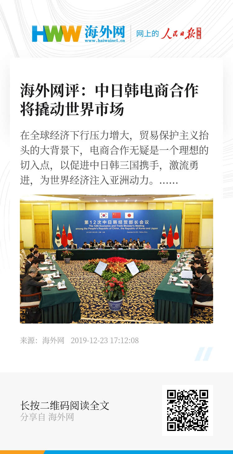 在全球经济下行压力增大,贸易保护主义抬头的大背景下,电商合作无疑是一个理想的切入点,以促进中日韩三国携手,激流勇进,为世界经济注入亚洲动力。(海外网评论员 任天择)