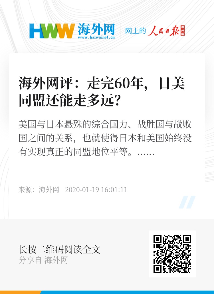 1月19日,作为战后日美同盟的根基、现行的《日美安全保障条约》迎来签署60周年纪念日。日本首相安倍晋三当天出席在外务省饭仓公馆举行的相关纪念仪式,并发表演讲。安倍表示,“日美安保条约守护亚洲和印度太平洋、世界的和平,也是保障繁荣的支柱”。美国当地时间18日,特朗普总统发表声明称,“随着安全保障环境的变化,出现了新的问题,进一步深化美日同盟是至关重要的。今后,期待在安保方面,日本作出更多贡献”等。