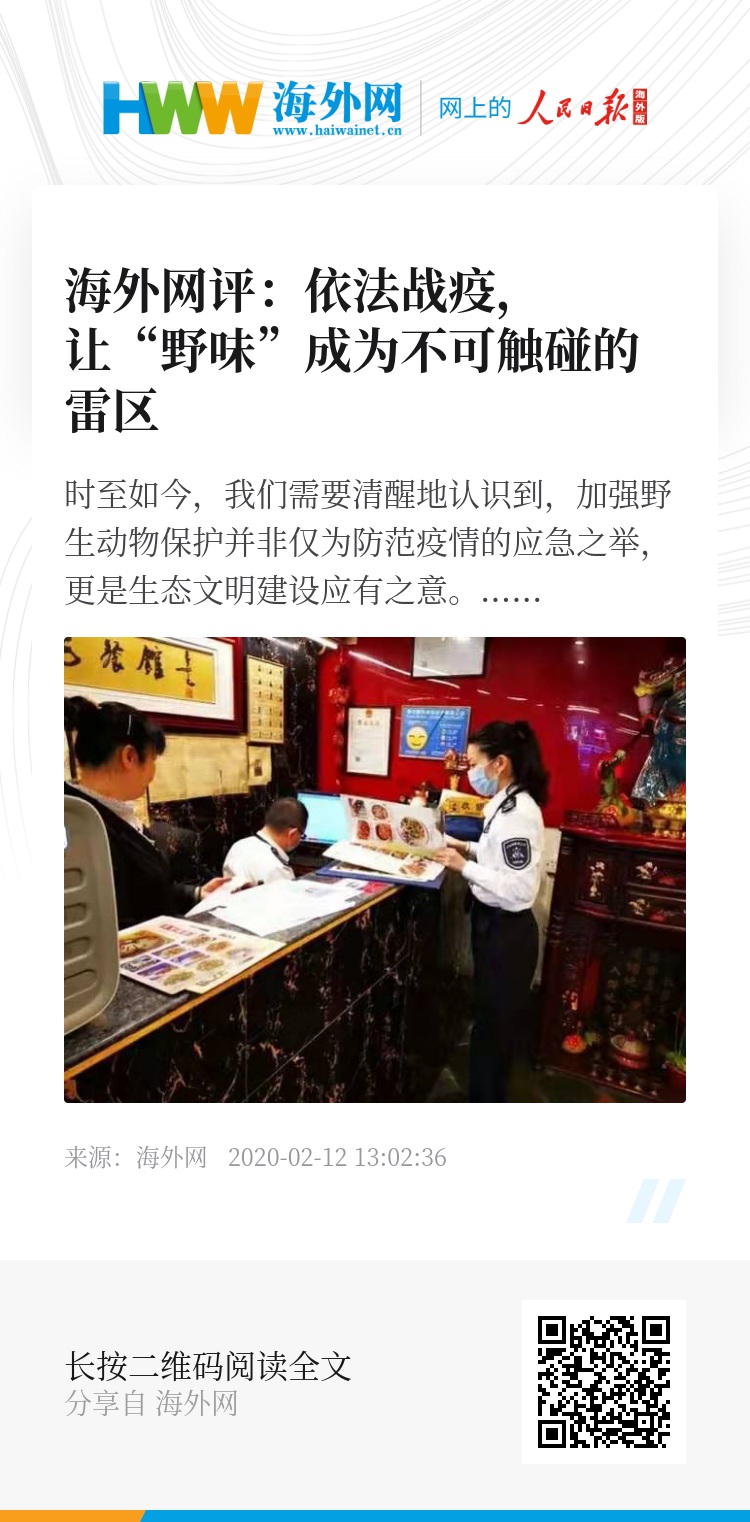 人类必须敬畏自然、尊重自然、顺应自然、保护自然,“像保护眼睛一样保护生态环境”。拒绝滥食野生动物正是对于人类与自然和谐共生这一价值观念的遵循。时刻谨记,保护野生动物就是保护人类自己,敬畏自然就是珍爱生命。(海外网评论员 栾雨石)