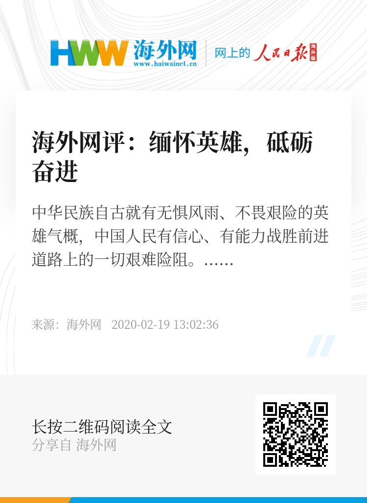 为有牺牲多壮志,敢教日月换新天。中华民族自古就有无惧风雨、不畏艰险的英雄气概,中国人民有信心、有能力战胜前进道路上的一切艰难险阻。中华民族伟大复兴的关键一程,更加迫切呼唤群英荟萃,更加需要激荡雄风浩气。愿我们每一次对英雄的仰望,都是一次唤醒人生意义的自我点名;每一次对英雄的缅怀,都成为一次砥砺奋进的郑重宣誓。(海外网评论员 孟庆川 王法治)