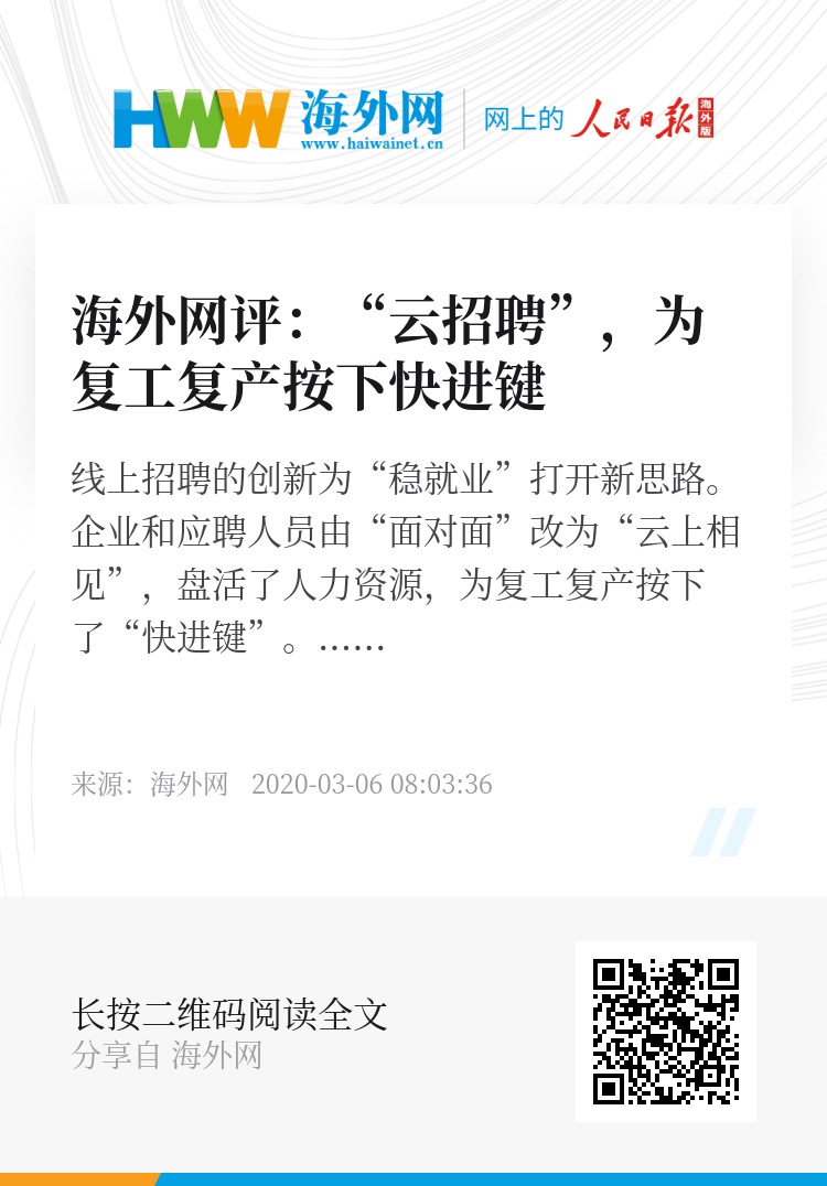 疫情之下,线上招聘的创新为“稳就业”打开新思路。企业和应聘人员由“面对面”改为“云相见”,盘活了人力资源,为复工复产按下了“快进键”。(海外网评论员 赵壹晨)