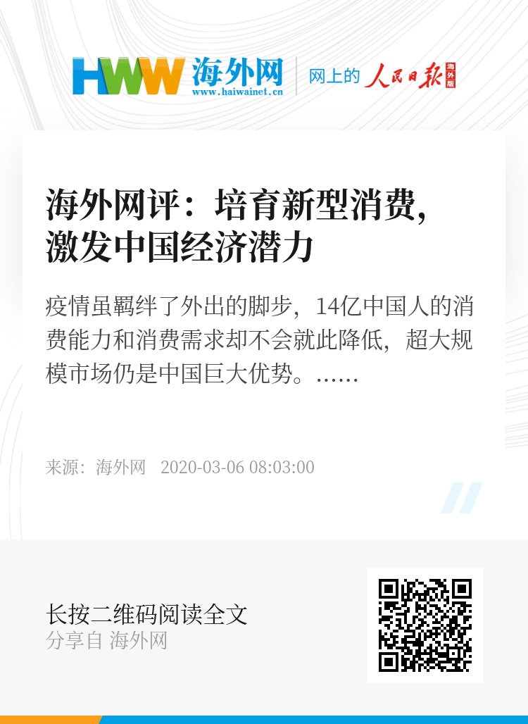 方兴未艾的新型消费折射出庞大的内需潜力,把复工复产与扩大内需结合起来,释放被抑制、被冻结的消费,培育壮大新型消费、升级消费,一定能够实现疫情防控和经济社会发展的双胜利。(海外网评论员 栾雨石)