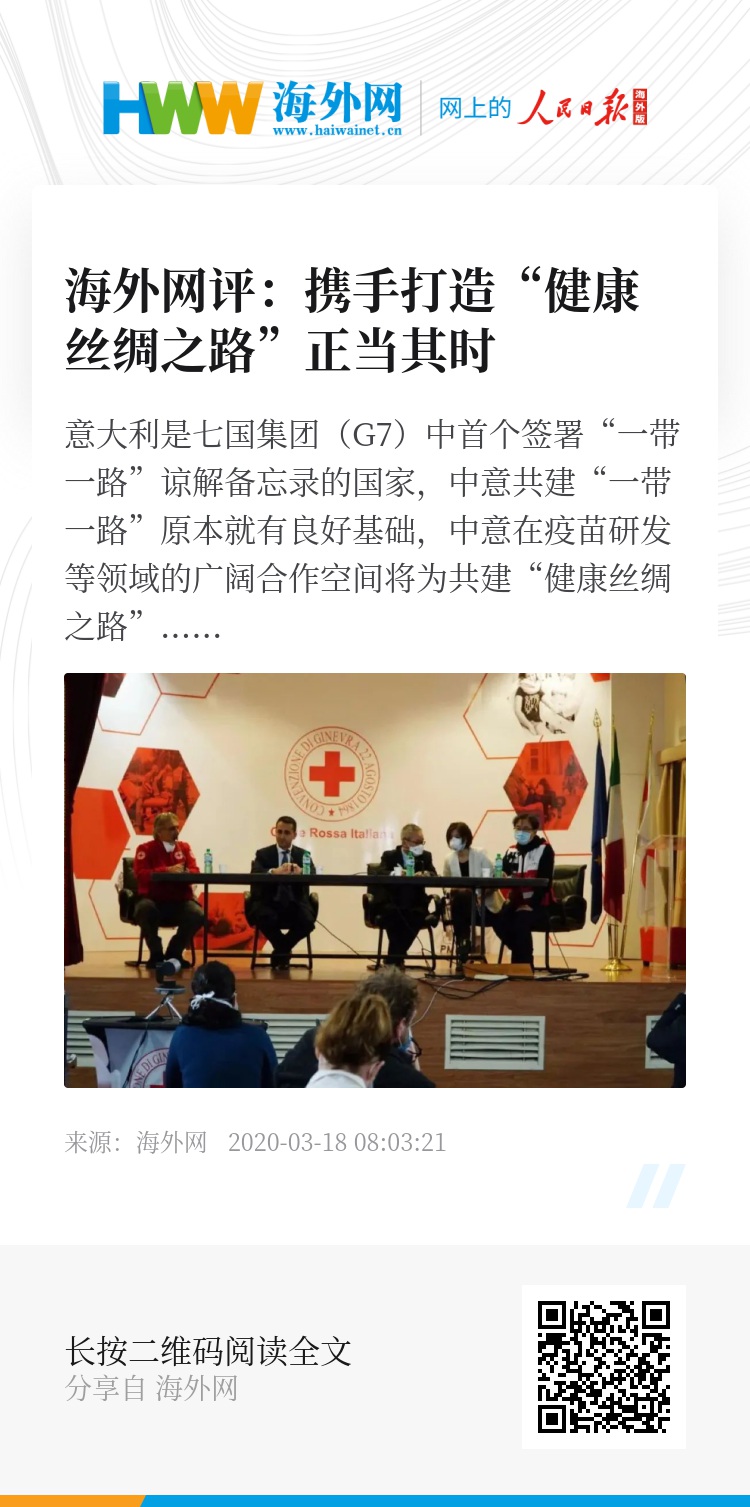 此时强调中意共建“健康丝绸之路”,对携手抗击疫情具有重要现实意义。截至当地时间3月16日18时,意大利确诊27980例,已连续3天新增确诊病例数破3000,疫情形势十分严峻。中意在抗击疫情方面一直保持良好沟通与合作,两国专家通过视频连线等方式就快速诊断、治疗方法等进行交流。近日,中国向意大利派出医疗专家组,不仅带去防护物资、常用药品等,还与当地医院和专家分享疫情防控经验,开展技术交流。与此同时,中意双方还将继续深化在药品研发等方面的合作,两国应急协调部门也将进一步探讨具体合作设想。这些都是共建“健康丝绸之路”的应有之义。