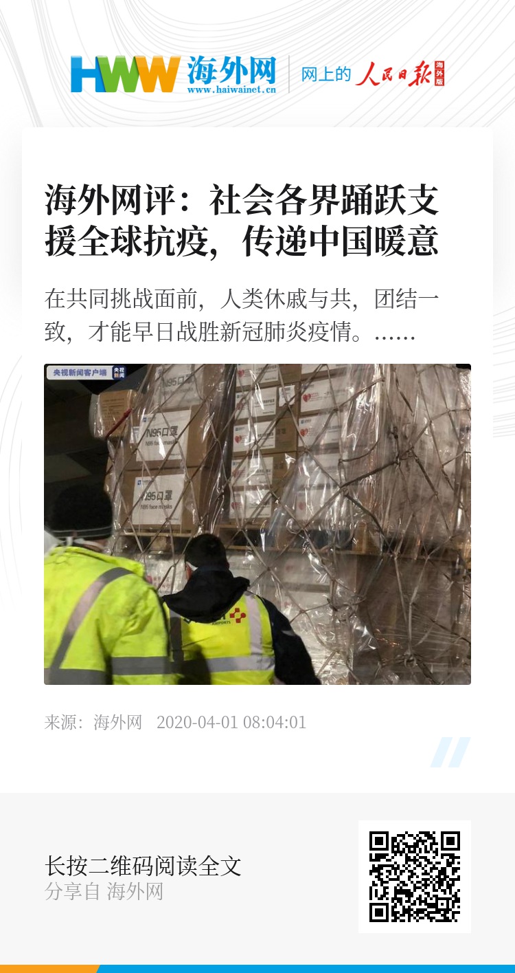 “道不远人,人无异国”。在共同挑战面前,人类休戚与共,团结一致,才能早日战胜新冠肺炎疫情。相信通过此次疫情,世界将更加深刻体会到中国人的可亲,中国社会的善意。(海外网评论员 孟庆川)