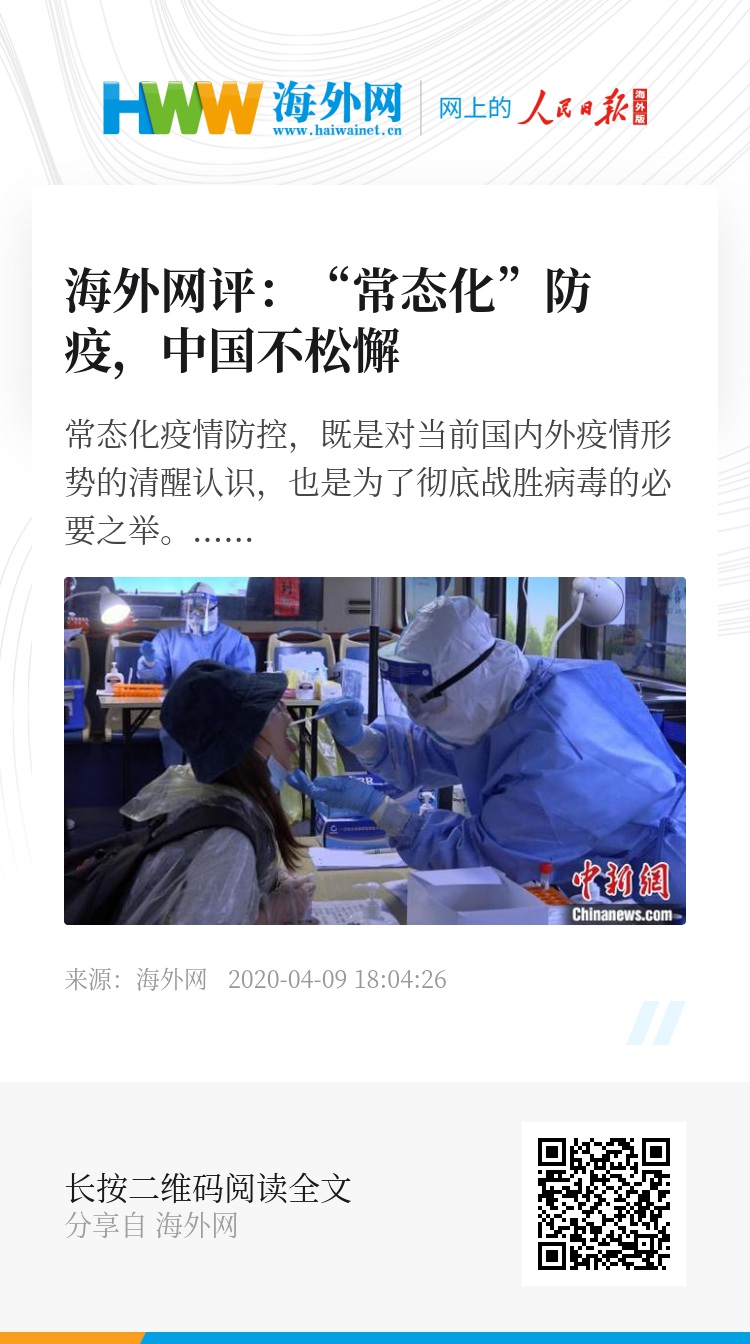 在疫情全球蔓延的危急时刻,中国慎终如始做好常态化疫情防控,既是对14亿中国人民负责,也是对全球抗疫的积极贡献。(海外网评论员 孟庆川)