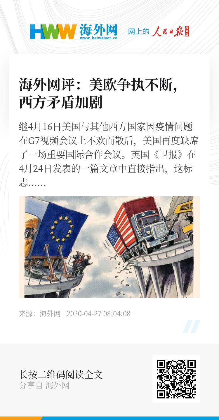 而在如何看待全球抗疫问题上,美国与欧洲也存在巨大分歧。中国国际问题研究院副研究员扈大威表示,疫情暴发伊始,欧洲本希望美国牵头进行疫苗研究、领导各国抗疫,但特朗普政府不仅没能牵头抗疫,“断供”世卫组织等做法更是破坏了全球赖以缓和疫情的多边机制,“欧洲非常沮丧”。卡内基国际和平研究院欧洲网站曾在3月17日刊文称,美国拥有庞大的研究中心和顶级医疗诊所,本应与盟国携手合作,展现世界领导人的风采,但美国政府并不准备怎么做,“欧美间的争执体现了西方的脆弱”。