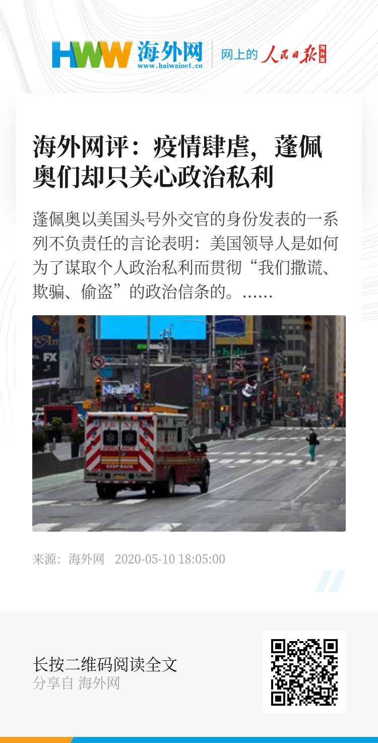 《华盛顿邮报》称,蓬佩奥的错误言论是一种外交政策渎职和不诚实的象征,这种行为使美国在世界上的受尊重程度和影响力都有所下降。而早在3月29日,该报评论版副主编杰克森·戴尔就发表评论,直接将蓬佩奥称为“美国历史上最差国务卿之一”。不知这样的舆情是否会让蓬佩奥们警醒:当美国政客们忙于“撒谎、欺骗、偷盗”之际,美国民众的生命福祉悬于一线,美国的国际形象也岌岌可危。(海外网评论员)