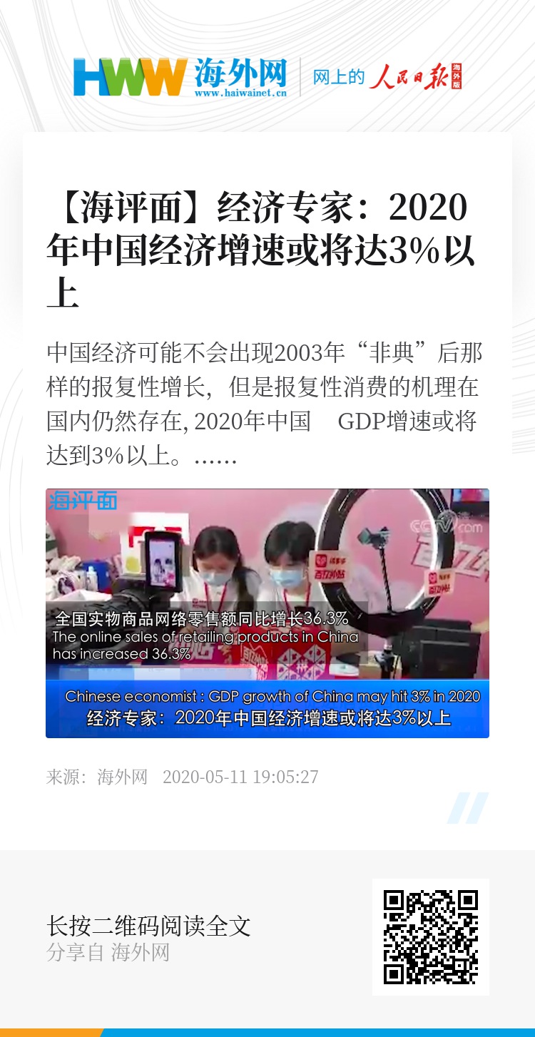 商务部大数据监测显示,“五一”期间全国实物商品网络零售额同比增长36.3%,为缓解疫情影响、促进消费回暖发挥了重要作用。北京大学经济学院教授曹和平认为,由于疫情在全球暴发,外部需求降低等因素,中国经济可能不会出现2003年“非典”后那样的报复性增长,但是报复性消费的机理在国内仍然存在,2020年中国 GDP增速或将达到3%以上。