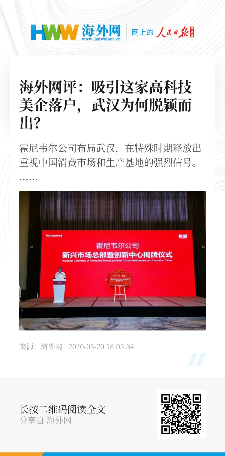 5月19日,霍尼韦尔公司新兴市场总部暨创新中心成立仪式在武汉东湖新技术开发区举行。这是2020年第一家在武汉设立独立法人公司的世界500强企业,也是霍尼韦尔在全球布局的首个新兴市场总部。霍尼韦尔公司布局武汉,在特殊时期释放出重视中国消费市场和生产基地的强烈信号。