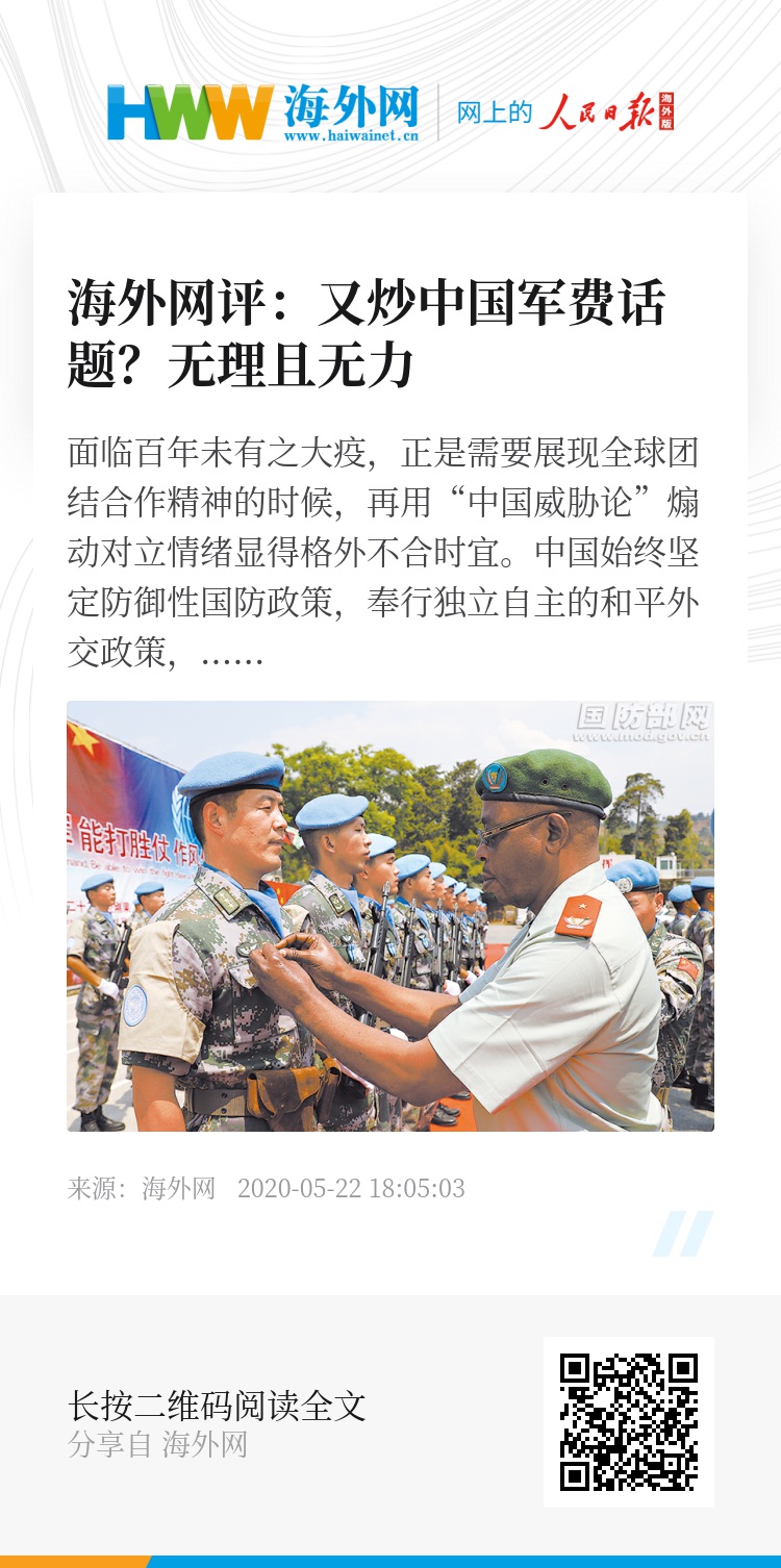 据新华社报道,中国2020年军费预算增长率为6.6%。这意味着,中国连续五年维持军费增长率保持个位数。尽管6.6%的增长率是近年新低,一些外媒仍同往年一样炒作中国军费话题。日本经济新闻称“在新冠疫情冲击下中国军费仍达新高”,美联社报道质疑中国军费透明度,称中国“将扩大在西太平洋和印度洋的军事存在”。种种论调,不过是“中国威胁论”的又一次炒作。面临百年未有之大疫,正是需要展现全球团结合作精神的时候,再用“中国威胁论”煽动对立情绪显得格外不合时宜。