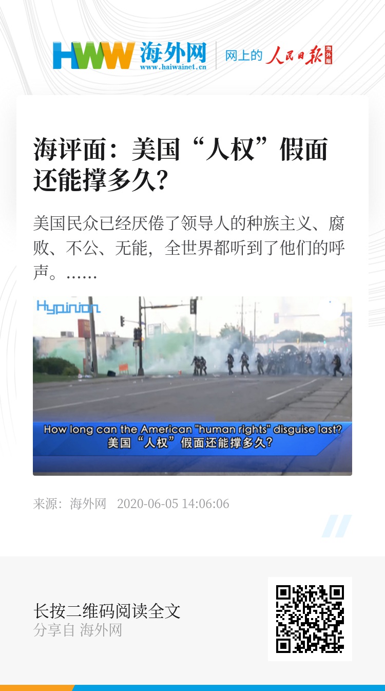 非洲裔男子弗洛伊德之死引发的席卷全美的抗议示威仍在继续。据美媒统计,美国警方目前已逮捕超过11000人。特朗普威胁动武,计划通过部署美国军队,迅速解决国内持续多天的抗议示威活动。共和党参议员克顿也威胁说可以调动多支军队,让“恐怖分子”无处可逃。在美国街头,军用直升机在空中盘旋,子弹在大街上乱飞,警车冲撞人群……这就是全世界指责别国“侵犯人权”的“道德卫士”。