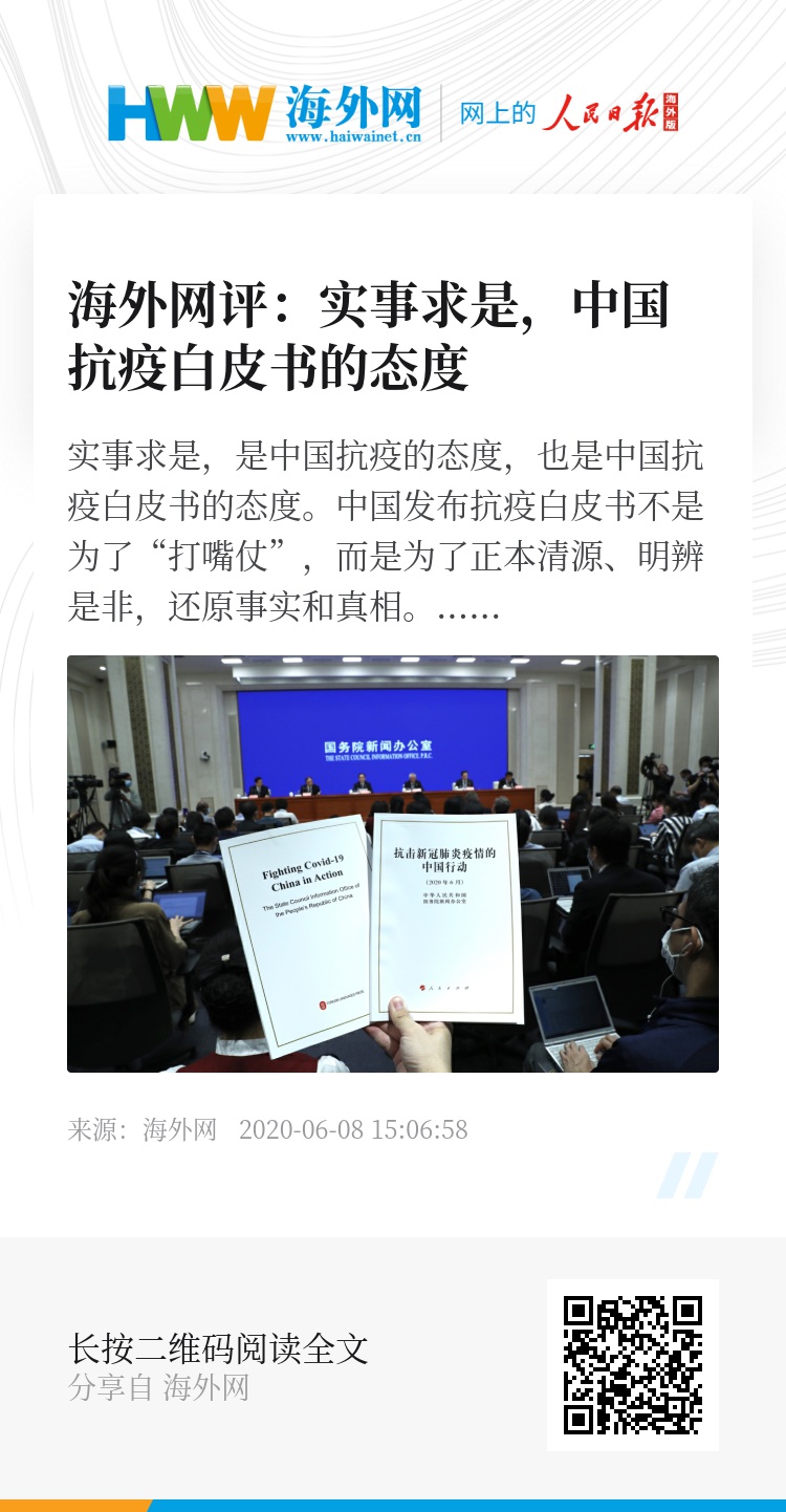 国务院新闻办6月7日发布《抗击新冠肺炎疫情的中国行动》白皮书(以下简称“中国抗疫白皮书”)。毫不意外,这份旨在全景式梳理中国抗疫全过程的白皮书在国际舆论场引发讨论,其中不乏《德国之声》这样的讽刺挖苦者,称中国用大量篇幅进行“自我表扬”,而对“隐瞒”只字不提。如何看待中国抗疫白皮书,就是如何评价中国抗疫。实事求是,是中国抗疫的态度,也是中国抗疫白皮书的态度。中国发布抗疫白皮书不是为了“打嘴仗”,而是为了正本清源、明辨是非,还原事实和真相。