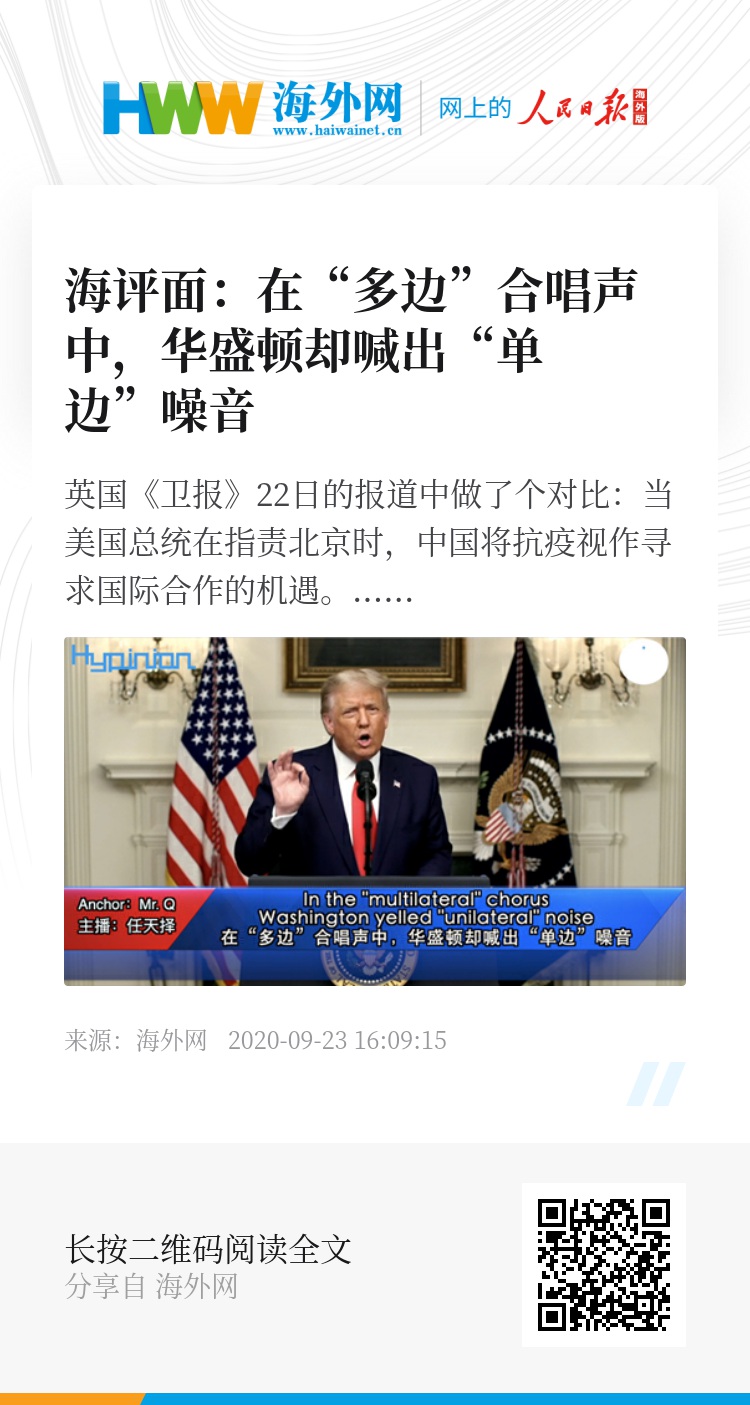 早在今年8月,联合国就布置好了发言主题:重申对多边主义的集体承诺。但华盛顿却执着于“业绩汇报”,强调“美国优先”,然后攻击别国,甚至攻击联合国等国际组织。英国《卫报》22日的报道中做了个对比:当美国总统在指责北京时,中国将抗疫视作寻求国际合作的机遇。