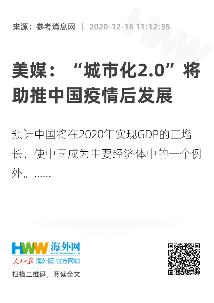 美国《财富》杂志网站12月13日刊发一篇观察报道称,“城市化2.0”将助推中国疫情后发展。全文摘编如下: