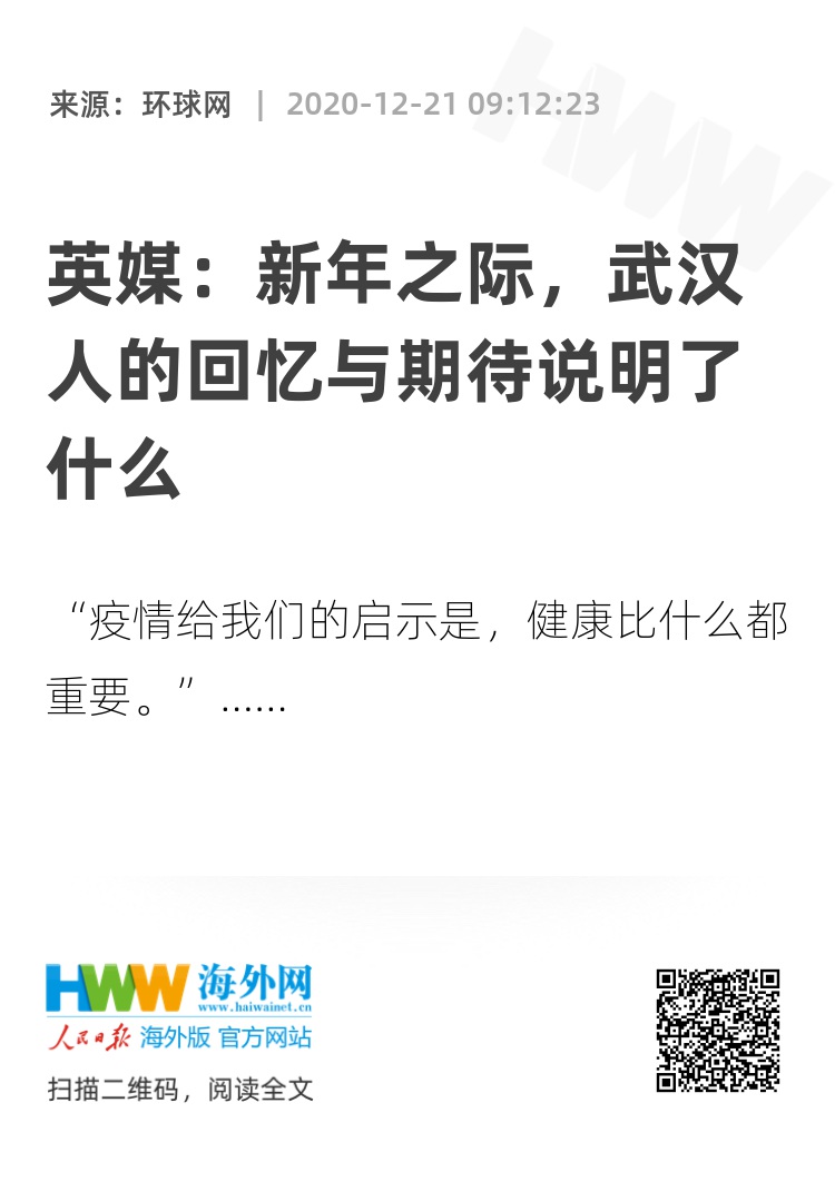 餐馆老板赖云(音)说:“仿佛封城只是昨天的事。”他很珍惜孩子在家中表演的回忆,“疫情给我们的启示是,健康比什么都重要。”街头食品摊贩江虹华(音)说:“疫情期间我们全家人都在一起,这很难得,我感到很幸福。我希望2021年生意红火。”街头跳舞大妈刘润莲(音)说:“2021年就要来了,我对自己没太高期盼。就希望生活平稳,祝愿人人平安。”(作者凯特·凯德尔等,丁玎译)