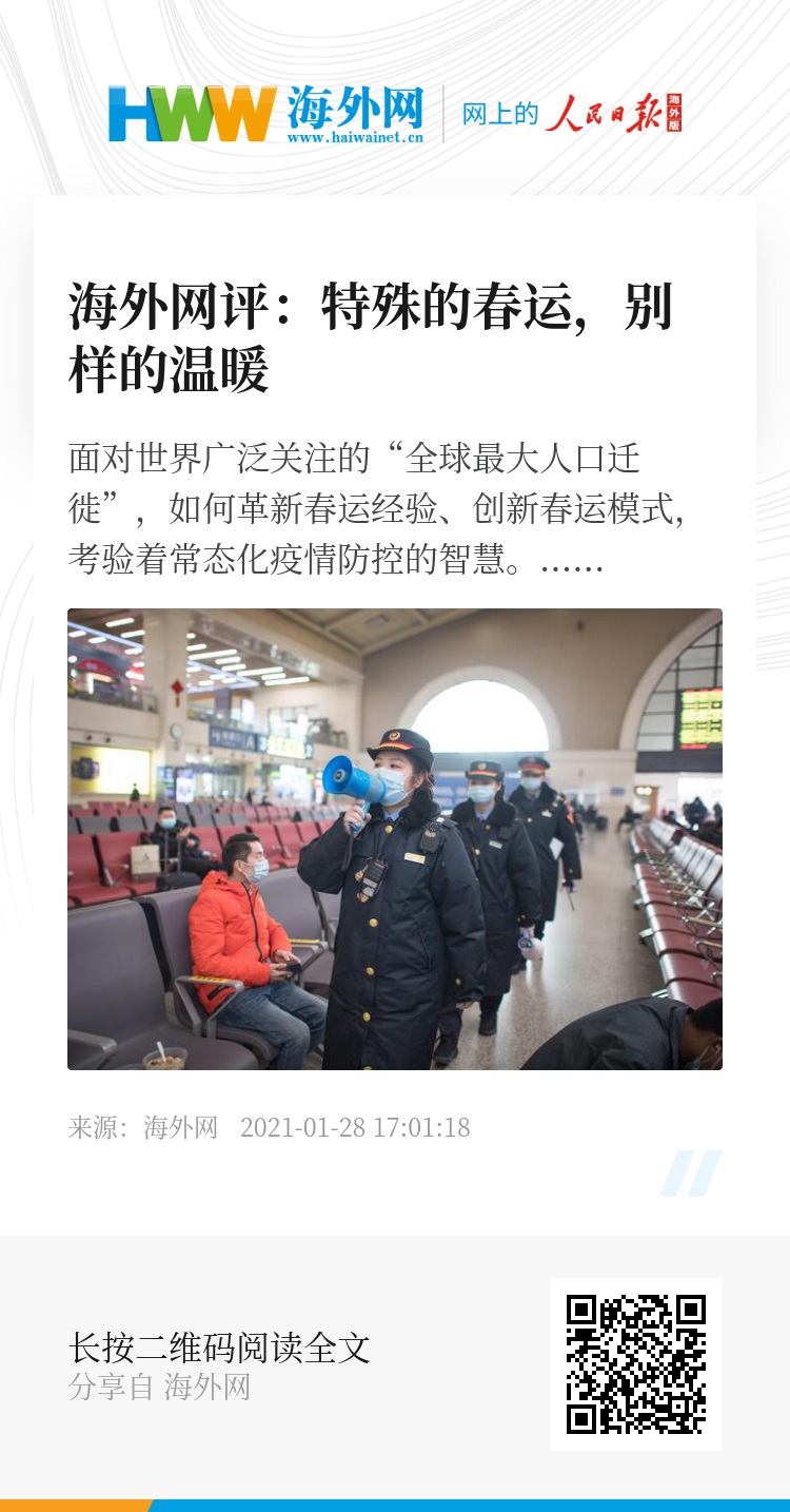 事实上,为织密织牢春运疫情防控“安全网”,保障返乡旅客安心有序踏上归途,民航、铁路、公路等部门早已行动起来。测温消杀、留置留观,铁路人昼夜备战;统筹安排运力、做好内外防控,民航人严把疫情防控关口。据铁路部门介绍,今年春运运量虽然较比往年有明显下降,但仍存在很大不确定性。面对世界广泛关注的“全球最大人口迁徙”,如何革新春运经验、创新春运模式,考验着常态化疫情防控的智慧。