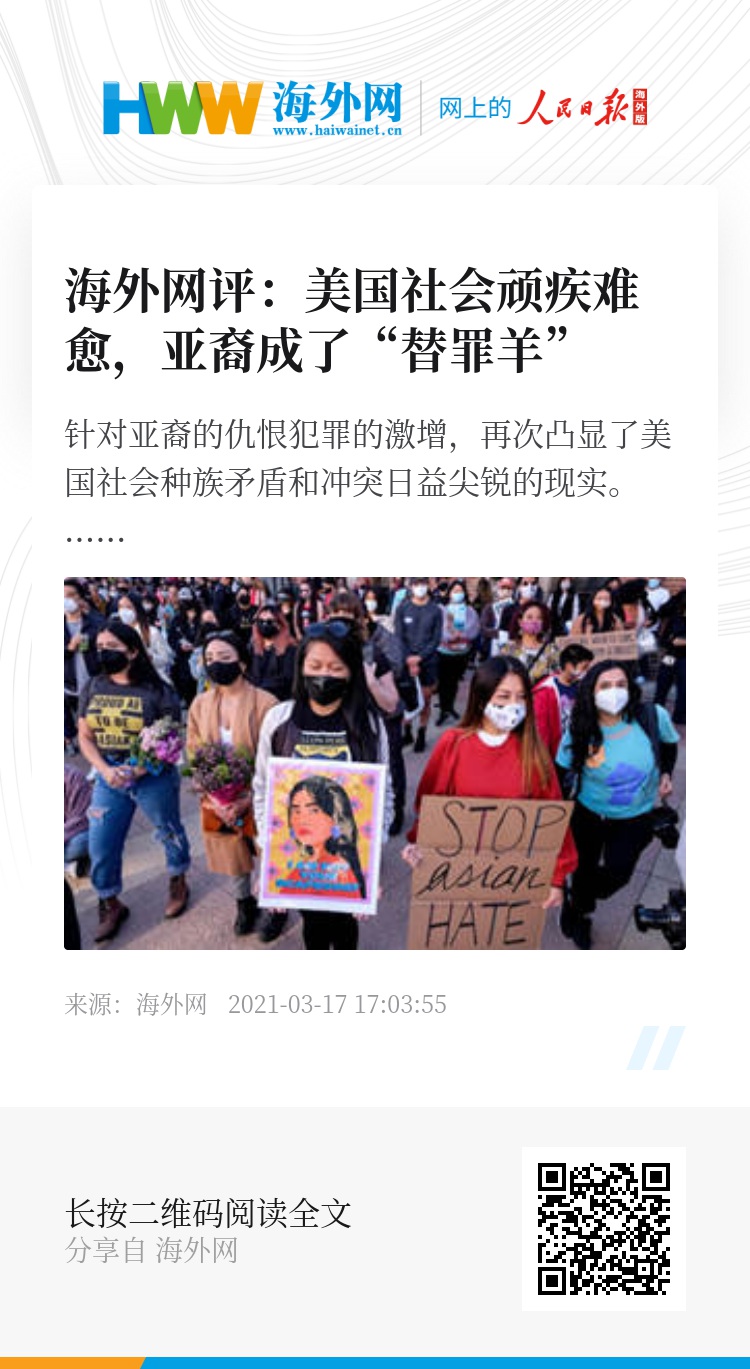 针对亚裔的仇恨犯罪的激增,再次凸显了美国社会种族矛盾和冲突日益尖锐的现实。韩裔律师在街头被人无端辱骂;菲律宾裔人士在地铁站被人砍伤而旁人无动于衷;华裔老人在街头被毫无理由地推倒在地、最终因此去世……这桩桩件件都表明,自诩为“山巅之城”的美国,早已陷入种族问题的泥淖无法自拔。若不能打破这种系统性种族歧视“闭环”,美国的所谓“治愈”终将是遥不可及的幻梦。(聂舒翼)