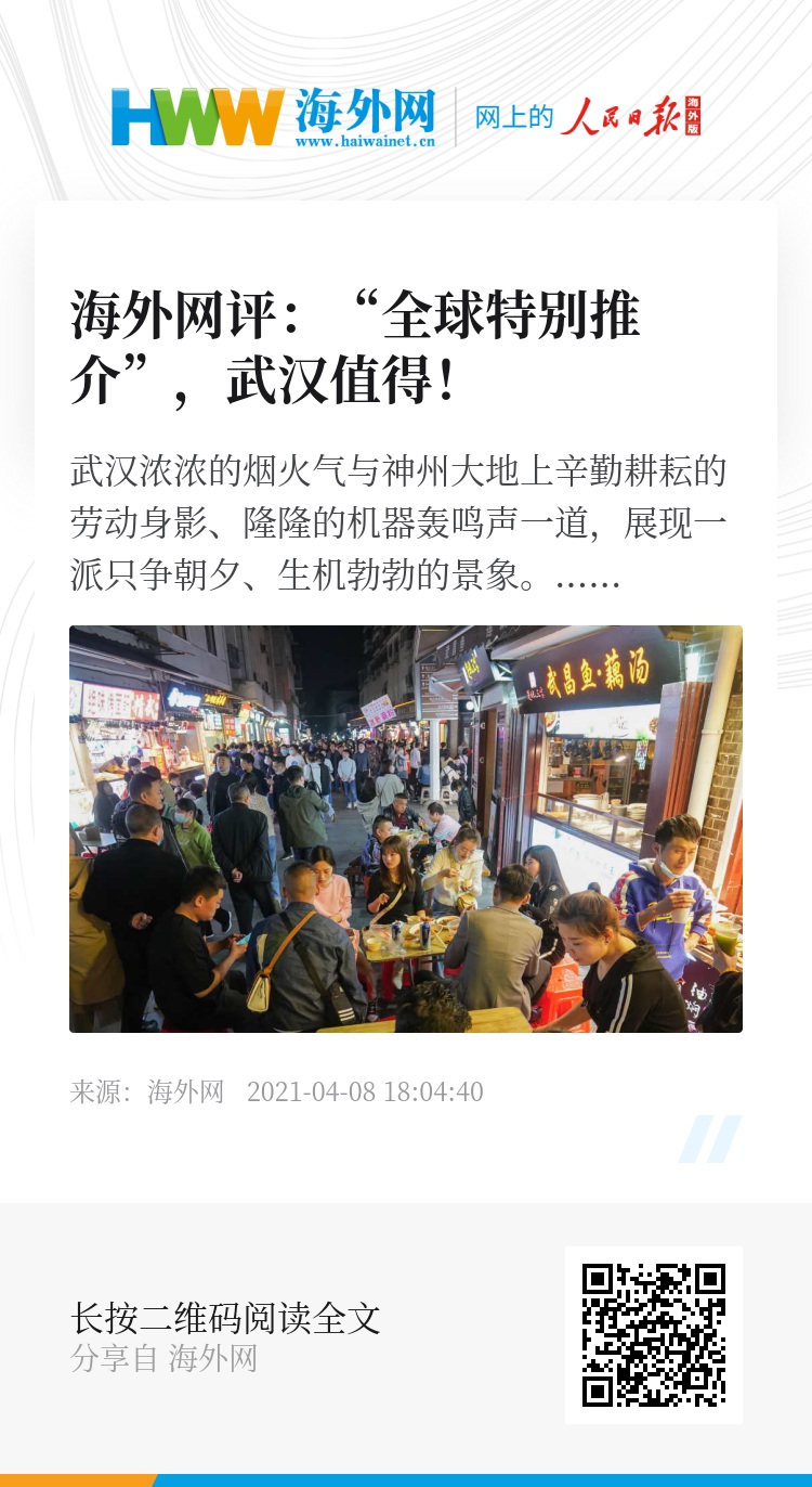 武汉重启一周年,传递着中国加快构建新发展格局的鲜明信号。武汉是中国中部地区中心城市,素有“九省通衢”之称,是长江经济带、中部崛起等多个国家战略的重要支点和“一带一路”重要节点城市。武汉重启以来,把握中国加快构建新发展格局的新机遇,重新融入全球经济产业链供应链。2020年,武汉数字经济占比超过40%,全年净增高新技术企业1842户,武汉“解封”后的首个国庆假期,吸引了超过1882万人次打卡;新开通国际货运航线6条,开辟海铁联运国际中转新通道,进出口逆势增长10.8%。长江沿岸铁路公司、霍尼韦尔新兴市场总部等35家企业总部、第二总部落户武汉。经历风雨后的武汉日益向上向好,充分反映着中国发展的巨大潜力。如今,“十四五”规划和2035年远景目标纲要提出,推动长江中游城市群协同发展,加快武汉、长株潭都市圈建设,打造全国重要增长极。长江经济带等国家战略正在深入实施,中央政治局会议审议了《关于新时代推动中部地区高质量发展的指导意见》……在中国加快构建新发展格局的道路上,武汉大有可为。中国集中精力办好自己的事,也将创造更多发展奇迹。