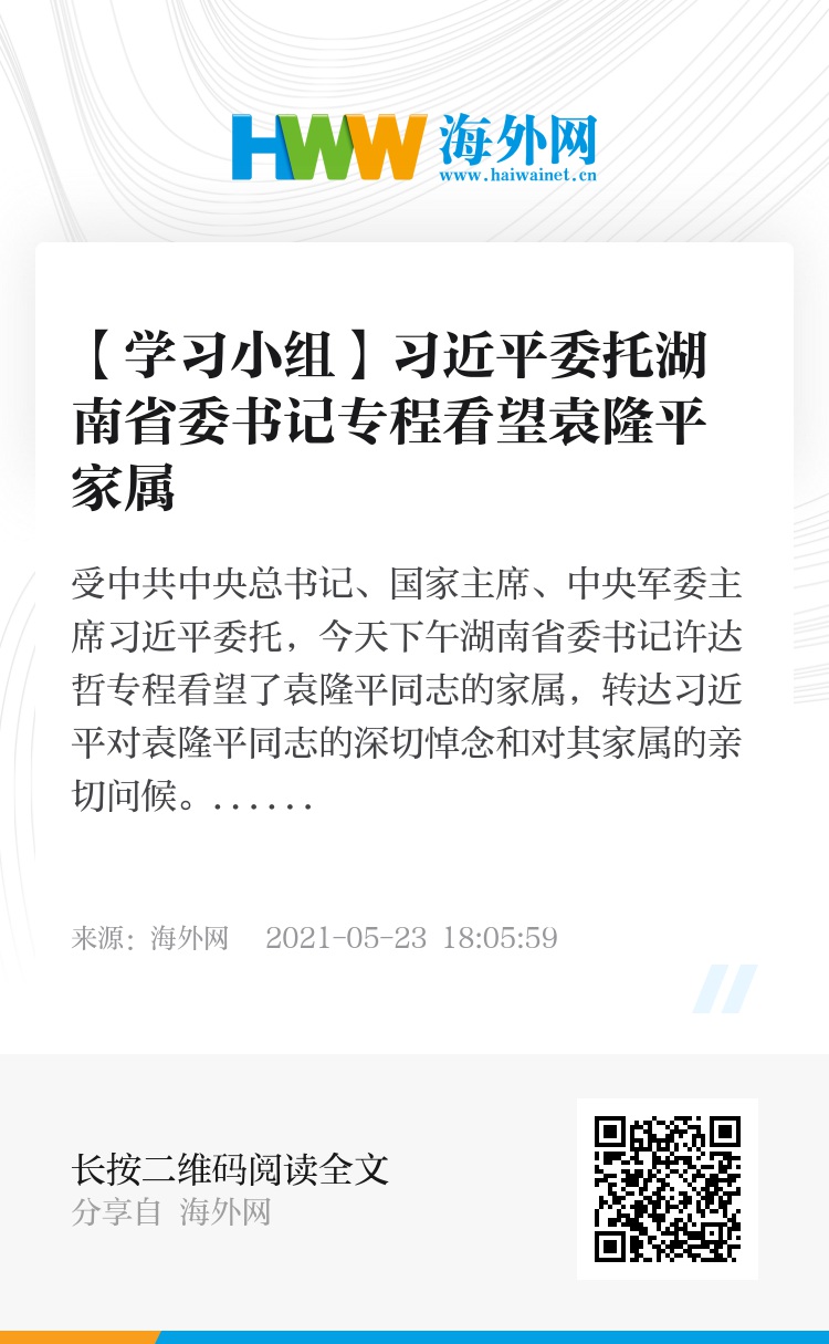 受中共中央总书记、国家主席、中央军委主席习近平委托,今天下午湖南省委书记许达哲专程看望了袁隆平同志的家属,转达习近平对袁隆平同志的深切悼念和对其家属的亲切问候。