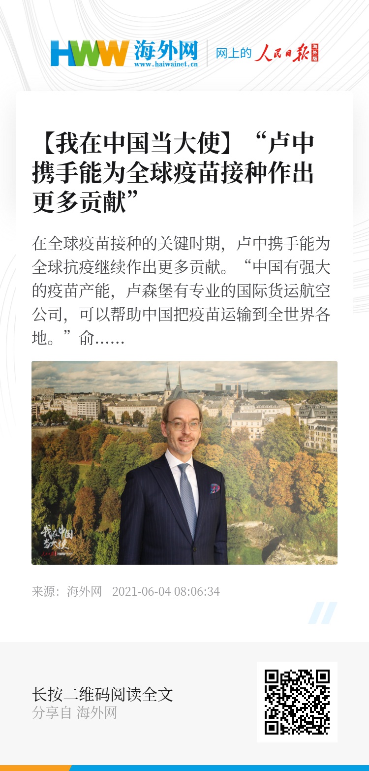 俞博生认为,在全球疫苗接种的关键时期,卢中携手能为全球抗疫继续作出更多贡献。“中国有强大的疫苗产能,卢森堡有专业的国际货运航空公司,可以帮助中国把疫苗运输到全世界各地。”俞博生说。(海外网 毛 莉 吴正丹)