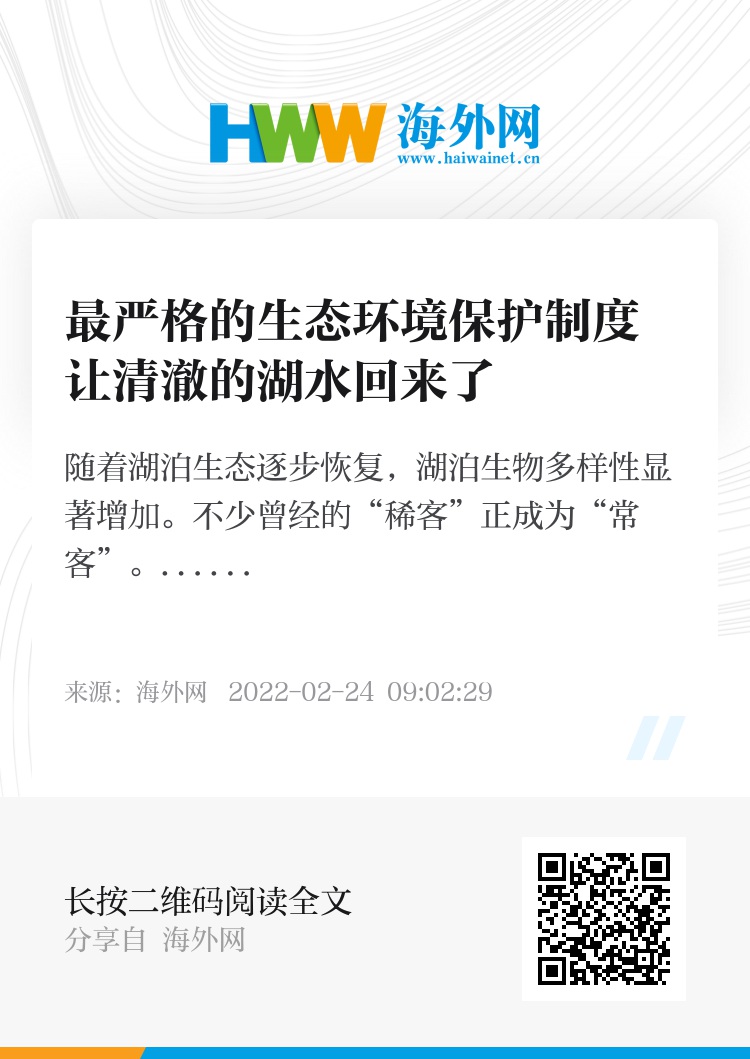 党的十八大以来,中国实行最严格的生态环境保护制度,加强湖泊保护、改善湖泊生态、维护湖泊健康,让湖水再次清澈、人水再度和谐。