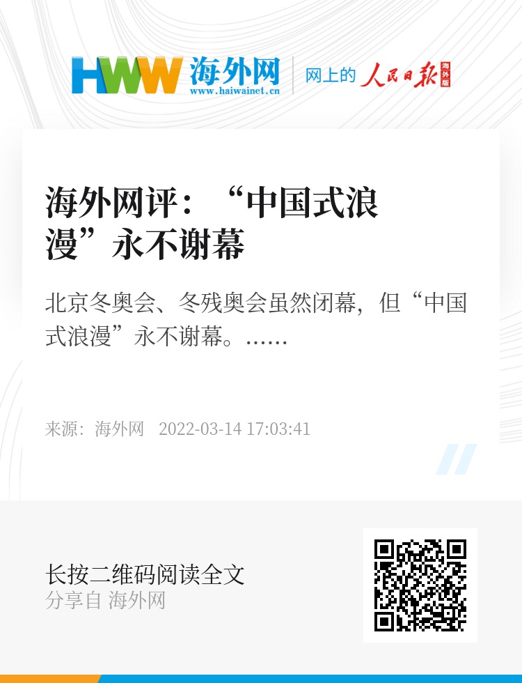 现代奥运之父顾拜旦曾说:“奥林匹克不是一场竞赛,而是一种源于内心的文化交流与融合。”如今,北京冬奥会、冬残奥会完美实现了这一理念,关于它们的精彩记忆也将在时光的流转中不断传递,成为中国留给世界的永恒财富。北京冬奥会、冬残奥会虽然闭幕,但“中国式浪漫”永不谢幕。(孟庆川)