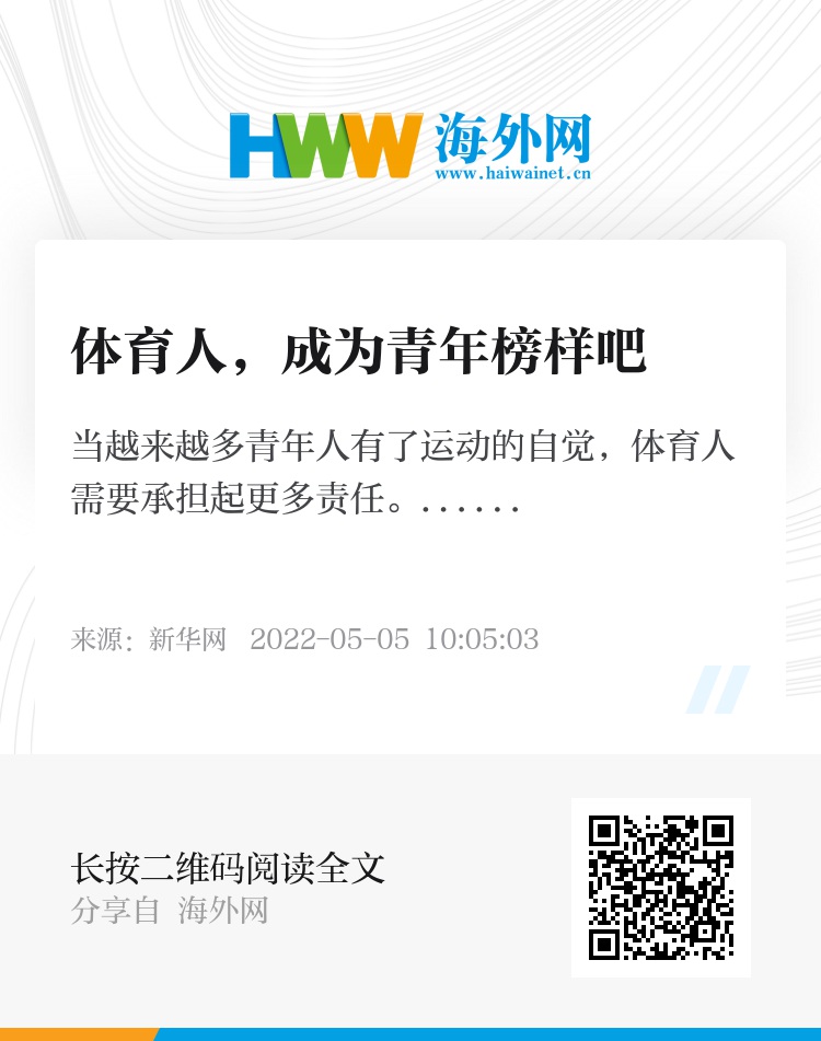 未来属于青年,希望寄予青年。体育人,请成为青年榜样,让青年一代以更健康的体魄、更顽强的精神,投入到新时代的奋斗之中,为自己和国家的美好未来而努力。(新华社记者王恒志)