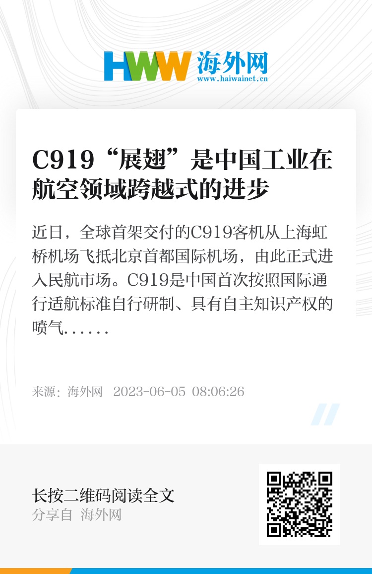 近日,全球首架交付的C919客机从上海虹桥机场飞抵北京首都国际机场,由此正式进入民航市场。C919是中国首次按照国际通行适航标准自行研制、具有自主知识产权的喷气式干线客机。中国国产大飞机“展翅”,吸引全球目光。